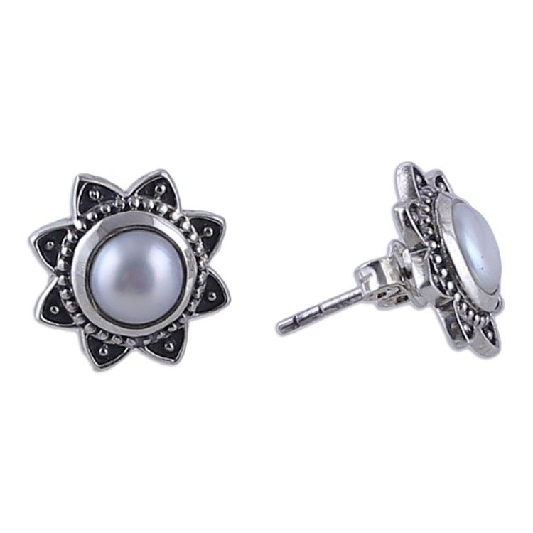 Flower-Shaped Sterling Silver and Pearl Button Earrings 'Pure Blossom' Item ID: 2671622141