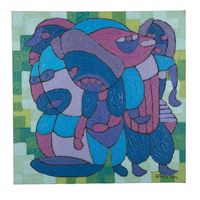 Folk Art Acrylic on Canvas Painting in Blue and Green Hues 'Best Friendship' Item ID: 2671765588