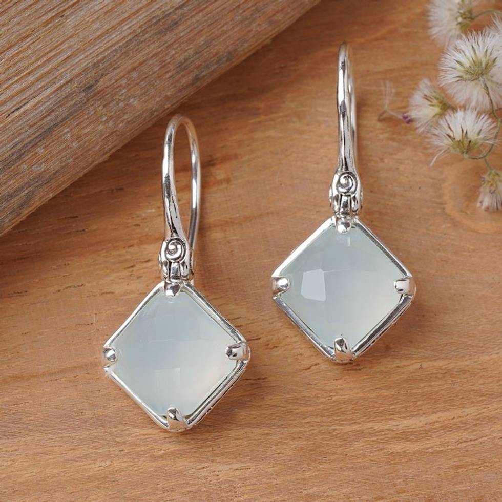 Folk Art-Inspired 1-Carat Faceted Chalcedony Dangle Earrings 'Harmony of Buddha' Item ID: 2671585234