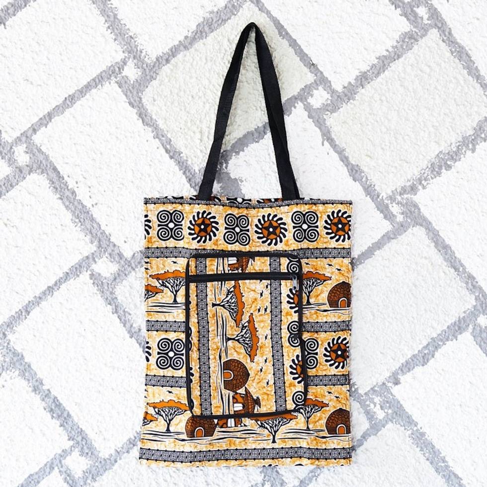 Folk Art-Patterned Self-Storing Cotton Tote Bag with Zipper 'Village Day' Item ID: 2671805522