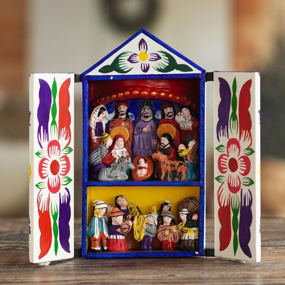 I bought this retablo a few years ago, and it's just now that I'm writing to express how beautiful it is. It inspires peace and celebration for the birth of the Savior. The simple brushes depicting the Peruvian mountains, the dark blue night and the bright star are added bonuses. The beautiful little characters fill me with joy. I never get tire of looking at them. For certain this is one of my favorite pieces (and I have bought many!).