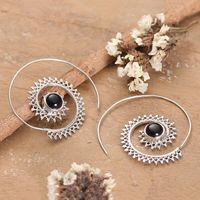 Folk Art-Themed Sterling Silver and Onyx Half-Hoop Earrings 'Spiral of Puissance' Item ID: 2676664509