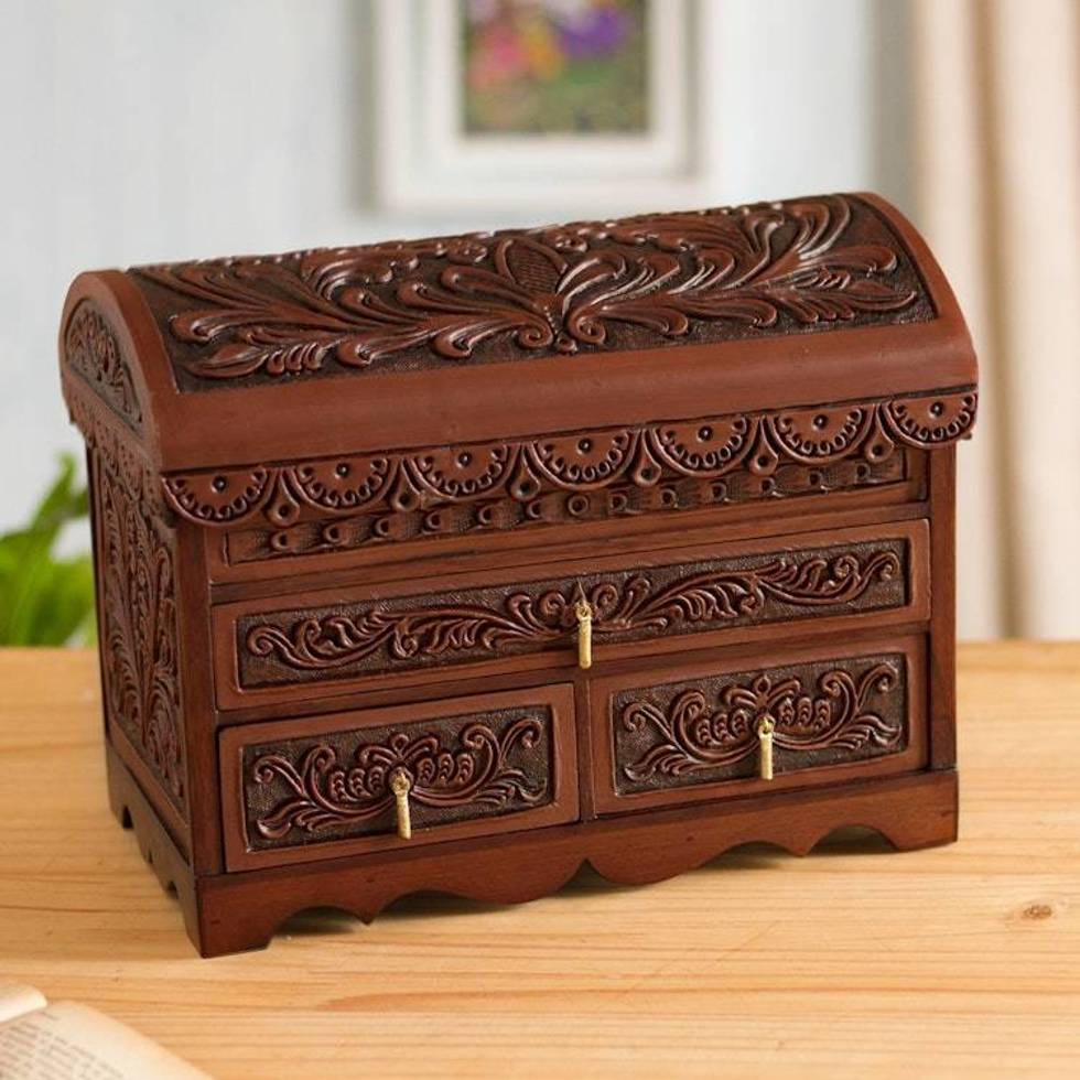 This little jewelry box is visually stunning and beautifully made. I use it as a backdrop for necklaces I sell on-line and its warm color and detailed carvings provide a beautiful contrast to my sparkling jewelry. It is a perfect size for a gift to a teen girl to store her treasures.
