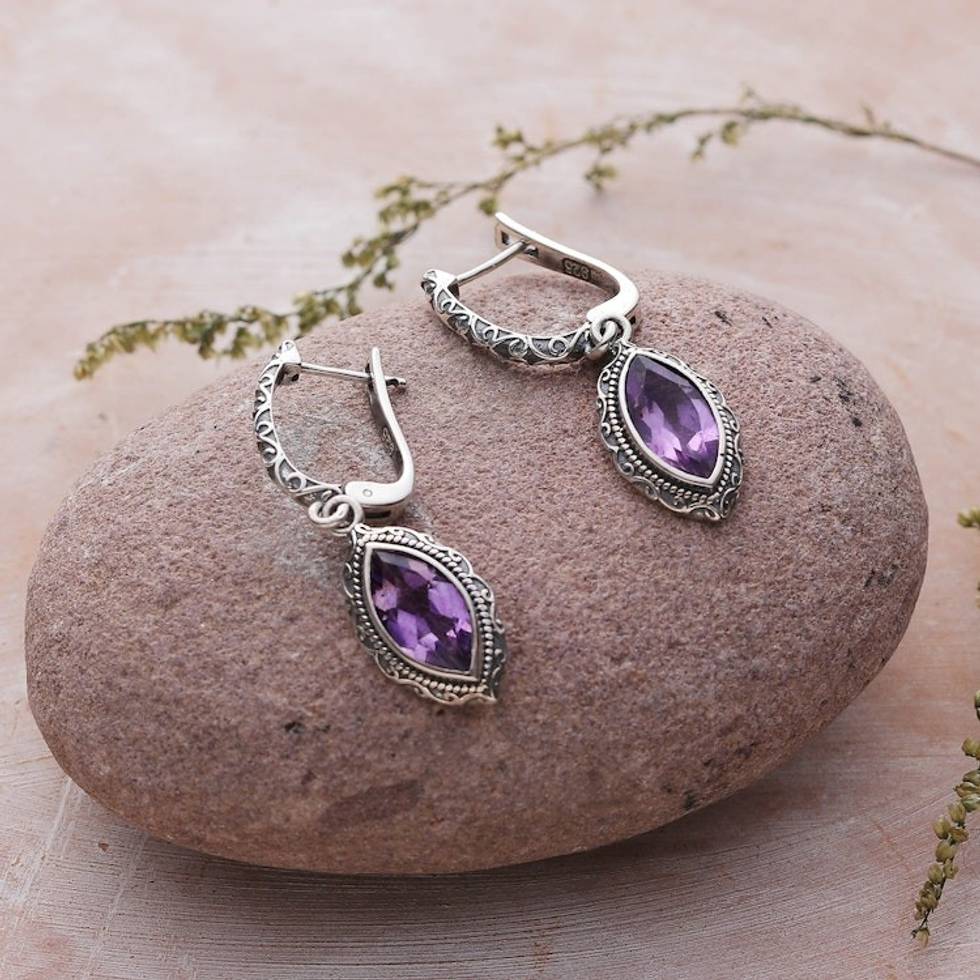 Four-Carat Marquise-Shaped Faceted Amethyst Dangle Earrings 'Sage Damsel' Item ID: 2671786799