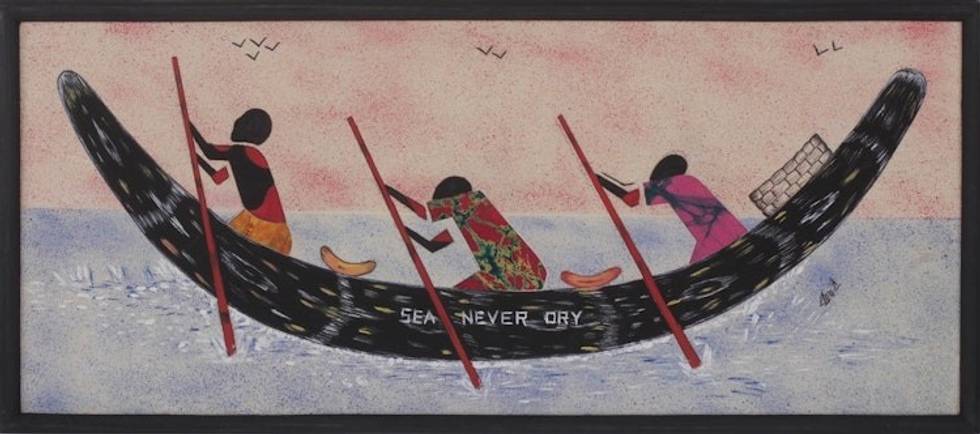 Framed Oil Painting on Cotton and Batik Cloth from Ghana 'The Lost Fishermen' Item ID: 2671803595