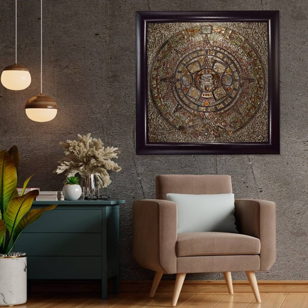 Framed Repousse Aztec Calendar Archaeology Alcohol Painting 'Mexica Sun Stone Calendar' Item ID: 2669903824