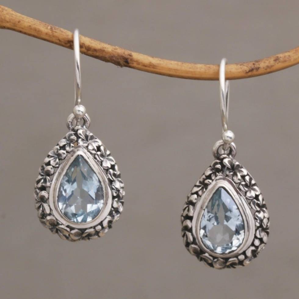 Frangipani Flower Dangle Earrings with Blue Topaz Gems 'Jepun Blue' Item ID: 2671820811