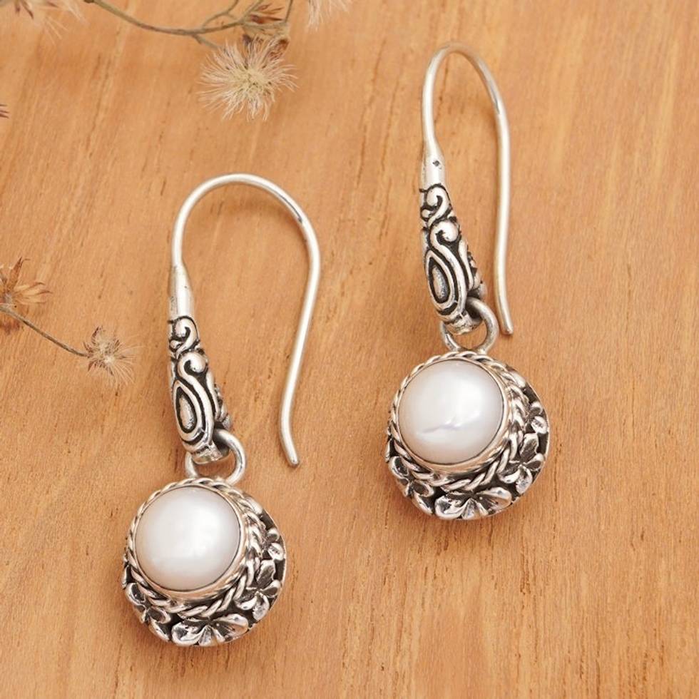 Frangipani Sterling Silver Dangle Earrings with Grey Pearls 'Frangipani Majesty' Item ID: 2671764866