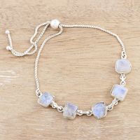 The photos on the webpage enlarge this bracelet quite a bit, making it look heavy and chunky. Actually it is a very delicate, feminine piece, with a thin chain. The moonstones are colorful and they glow; the silver that comprises the structural bed for the stones as well as the links between them, is very shiny. Together, these elements create a display that alternates iridescent GLOW and SHIN... read more