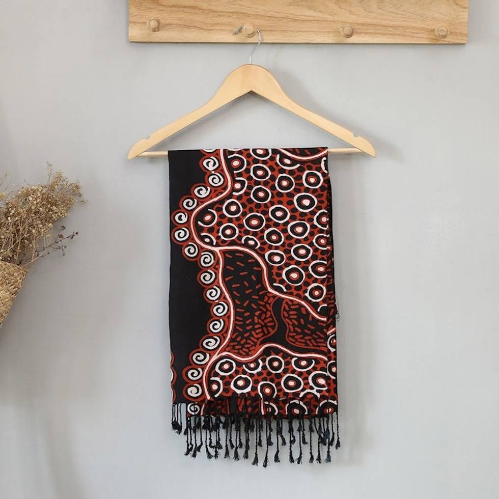 "Drape yourself in effortless chic with Erna Gendhis' heavenly batik rayon scarf. Its striking black, pumpkin and white motifs nod to time-honored Javanese craftsmanship yet feel entirely fresh and modern. With delicate fringe finishing on both ends, this gorgeous accessory makes any outfit pop with its signature blend of sophistication and uniqueness."