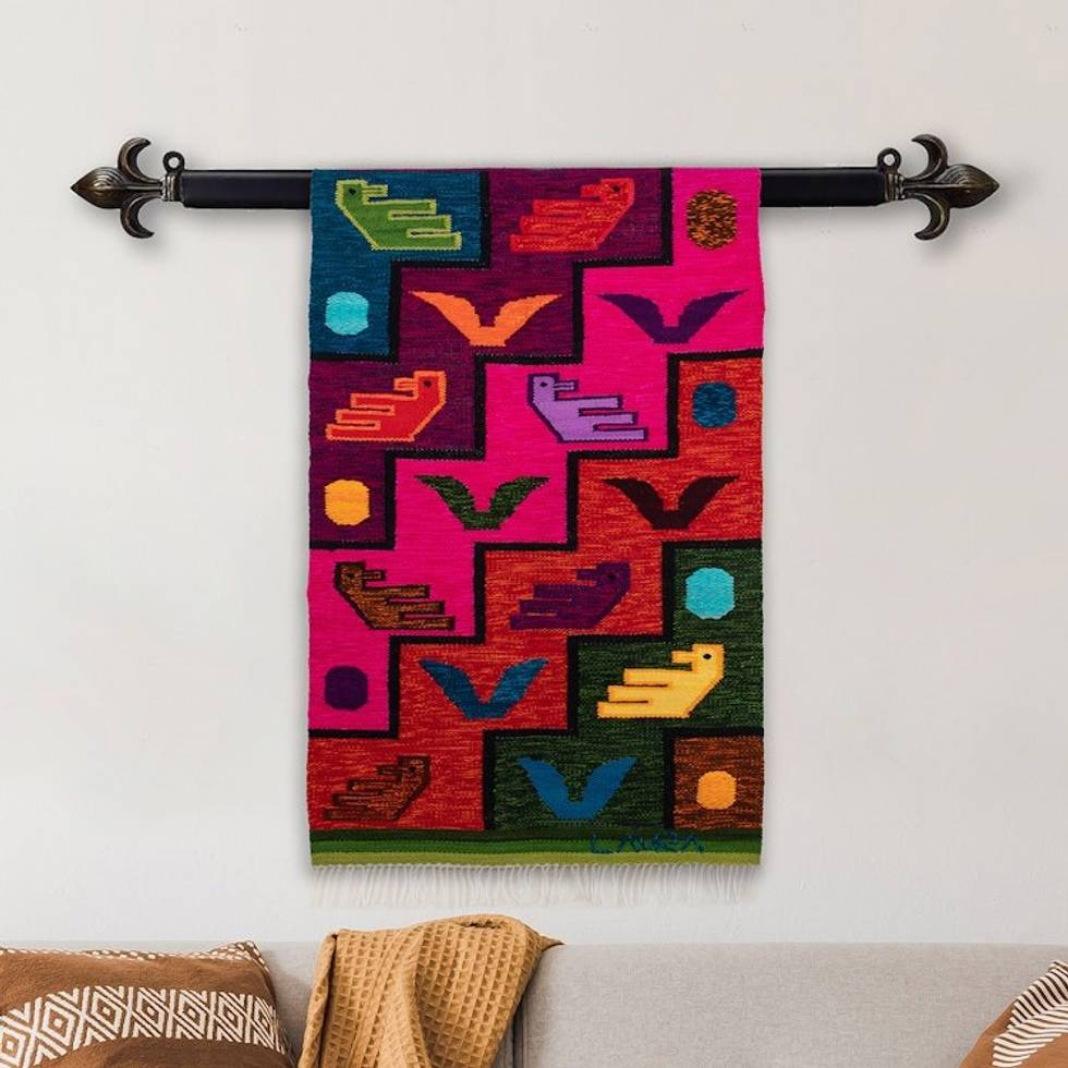 Fringed Bird-Themed Wool Tapestry Hand-Woven in Peru 'Childhood Dream' Item ID: 2671697909