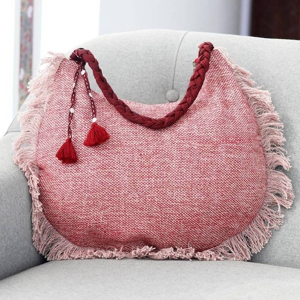 "Paint the town pink with this festive hobo-style bag designed by India's Manjuri Hazarika. Crafted from linen, the woven bag features a braided cotton handle adorned with two sequined cotton tassels, and a row of petal pink fringe that circles the bag from end to end. Inside, the bag is lined with crimson cotton and includes three pockets, two open and one zippered, while the bag's main section closes with a zipper."