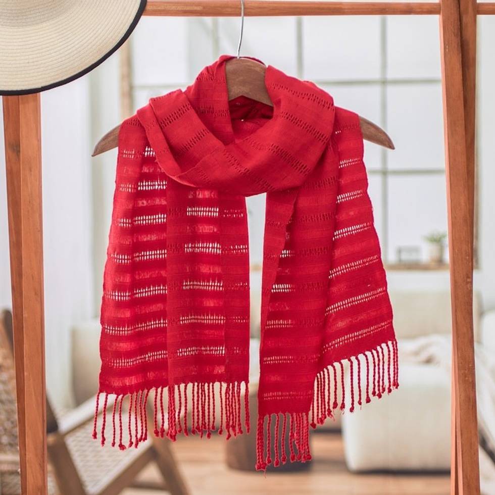 Fringed Red Scarf Hand-Woven from Rayon in Guatemala 'Among Threads in Red' Item ID: 2671771259