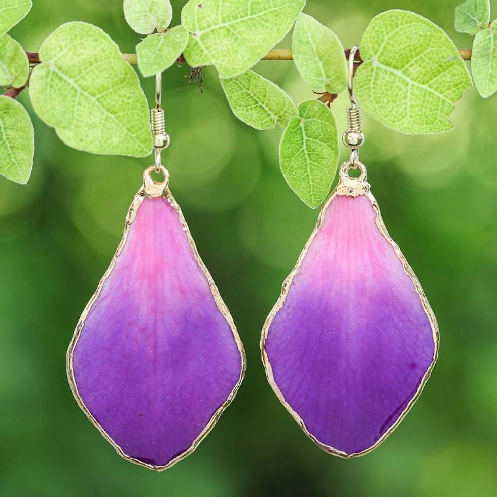 Fuchsia and Purple Petal 22k Gold-Accented Dangle Earrings 'Capricious Petal' Item ID: 2671646440