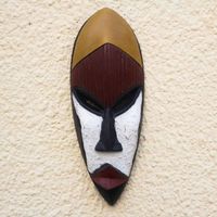 "This hand-carved sese wood mask is adorned with the colorful solemnity of the Ga people from Ghana. They call this mask Djealor, meaning 'wisdom is the key,' and it is worn to consult the oracle for guidance. Robert Nortey replicates the mask with faithful attention to detail."