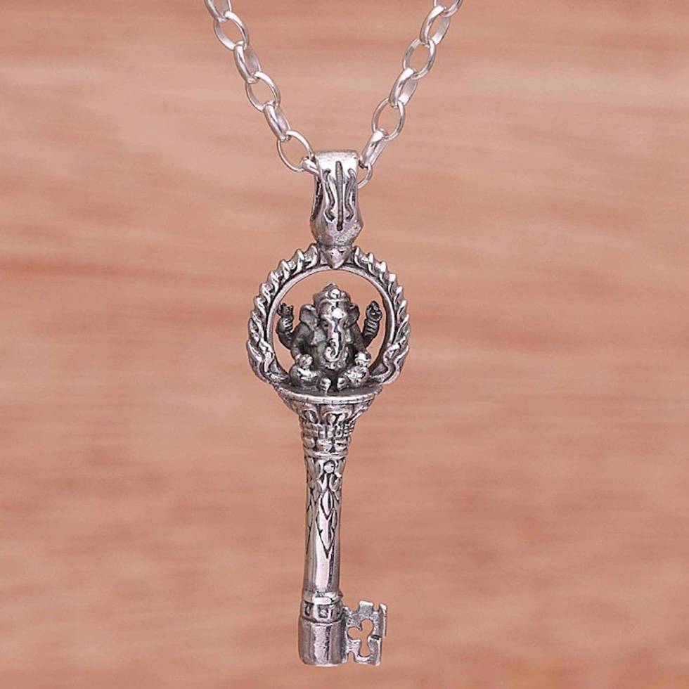 Ganesha-Themed Sterling Silver Pendant Necklace from Bali 'Key of Truth' Item ID: 2671820914