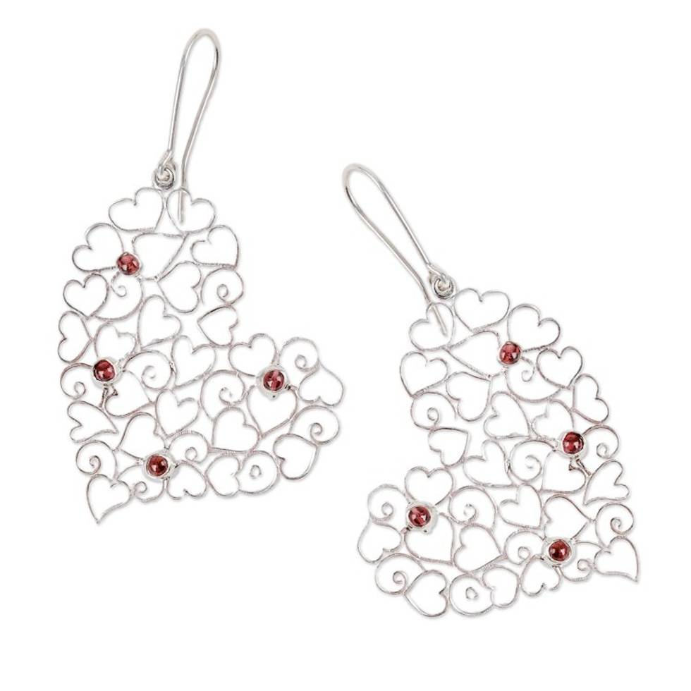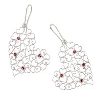 Garnet 925 Silver Heart Dangle Earrings with Openwork Accent 'Heart Tapestry' Item ID: 2669934768