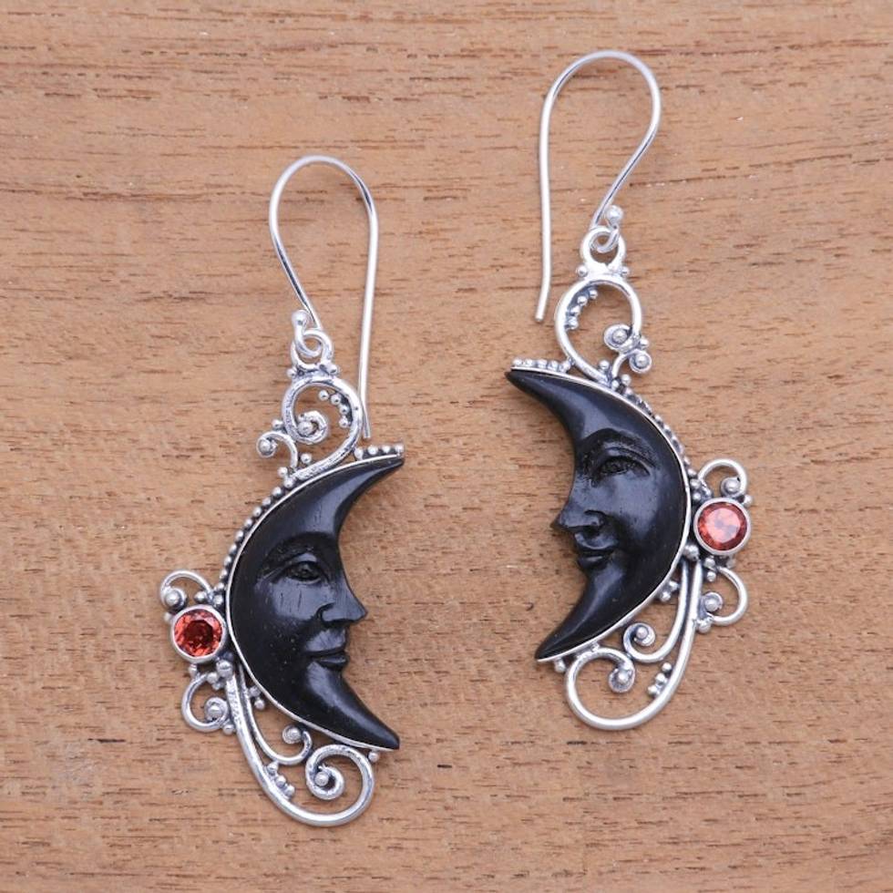 Garnet and Black Horn Crescent Moon Dangle Earrings 'Face of Midnight' Item ID: 2669919831