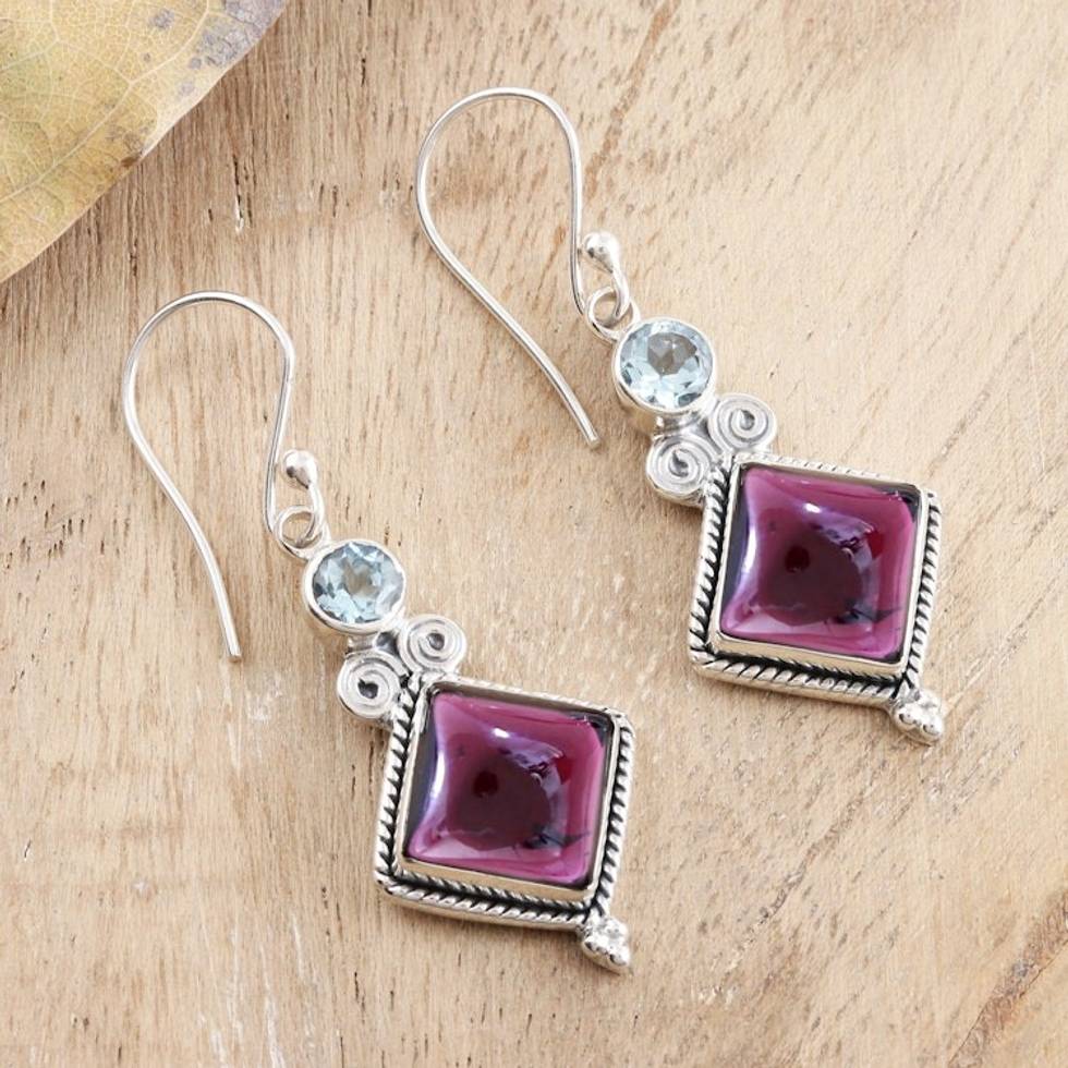 Garnet and Blue Topaz Dangle Earrings 'Faceted Fascination' Item ID: 2669942922