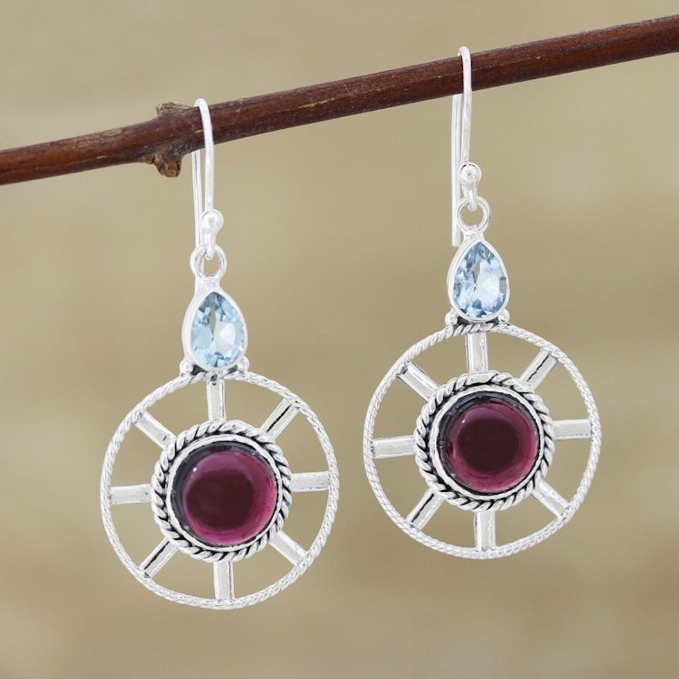 Garnet and Blue Topaz Dangle Earrings 'Wheel in the Sky' Item ID: 2671789889