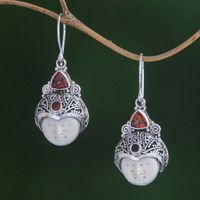 Garnet and Carved Bone Dangle Earrings from Bali 'Celuk Pangeran' Item ID: 2671736488