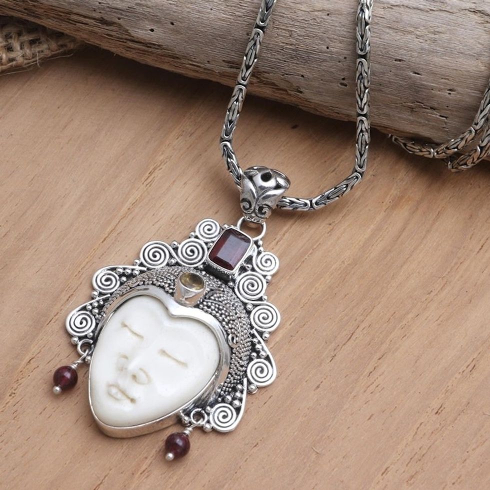 'Layonsari', carved pendant necklace with garnet is a pictured, with silver details and garnets of good color. Attractive chain, hangs pendant to good effect. Eye-catching. Well executed silver design setting for bone face carving. Happy with purchase.