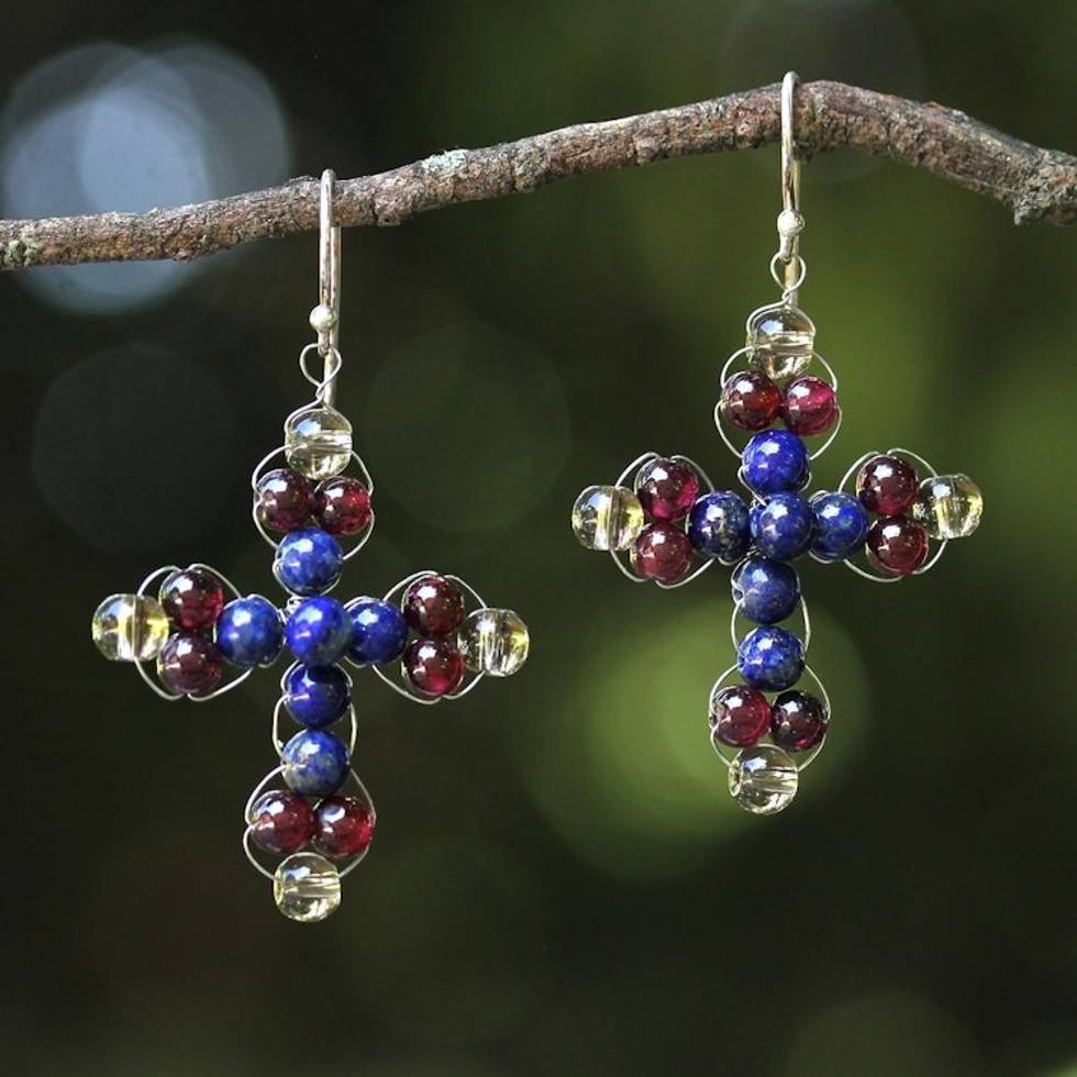 Garnet and Lapis Lazuli Cross Earrings from Thailand 'Cross of Hope' Item ID: 2671640757
