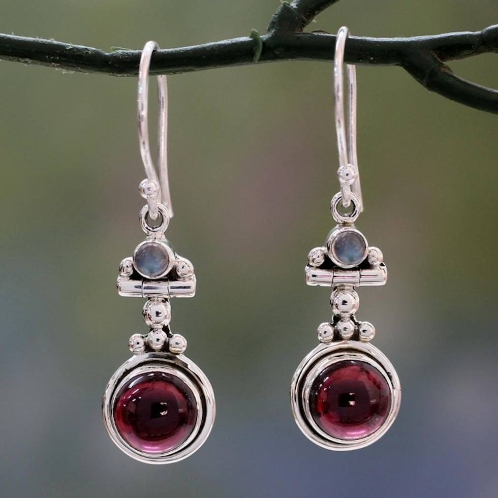 Garnet and Rainbow Moonstone Earrings Set in 925 Silver 'Misty Moon' Item ID: 2671620598