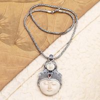 'Layonsari', carved pendant necklace with garnet is a pictured, with silver details and garnets of good color. Attractive chain, hangs pendant to good effect. Eye-catching. Well executed silver design setting for bone face carving. Happy with purchase.
