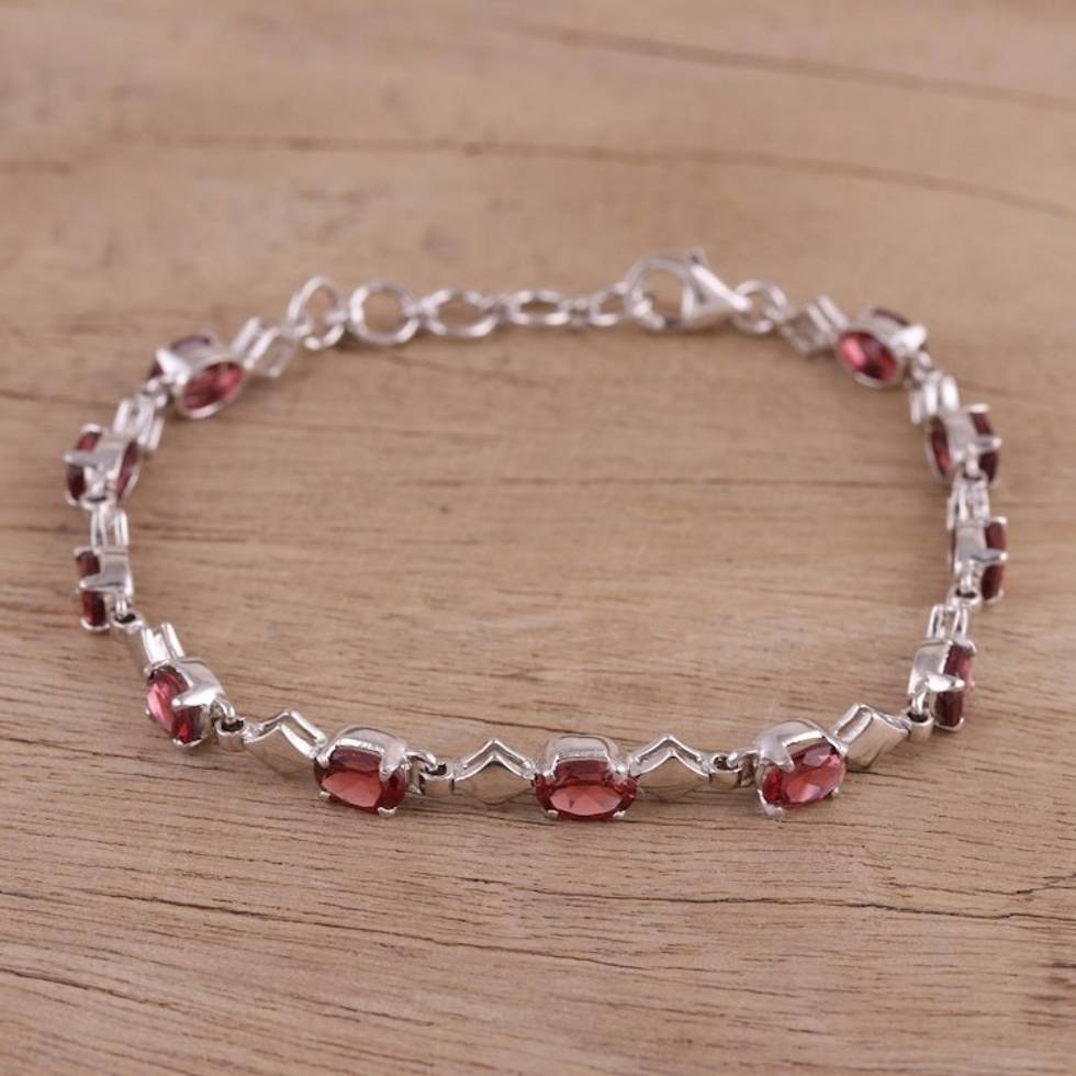 Garnet and Rhodium Plated Silver Link Bracelet from India 'Inspiring Red' Item ID: 2671790101