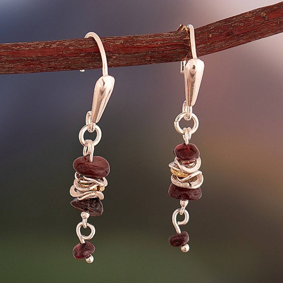 "With garnet as its absolute star, these dangle earrings balance bold color with delicate craftsmanship. Gleaming silver and gold-plated accents add a dynamic edge to Peruvian artisan Silvia Garcia's sophisticated creation, making it a versatile treasure that's destined to stand out in any collection."