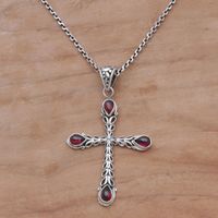 Garnet and Sterling Silver Cross Necklace from Bali 'Chapel Drops' Item ID: 2671479153