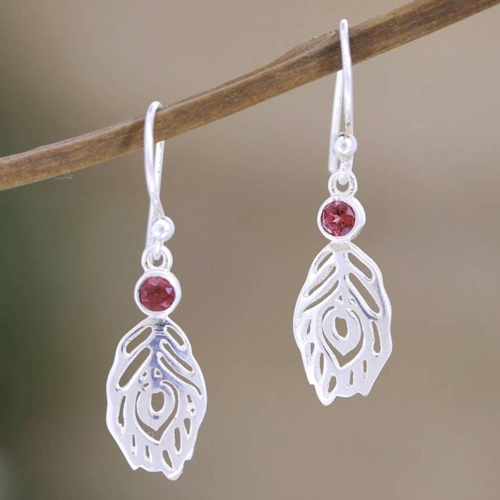 Garnet and Sterling Silver Dangle Earrings Crafted in India 'Feather Touch' Item ID: 2676664143