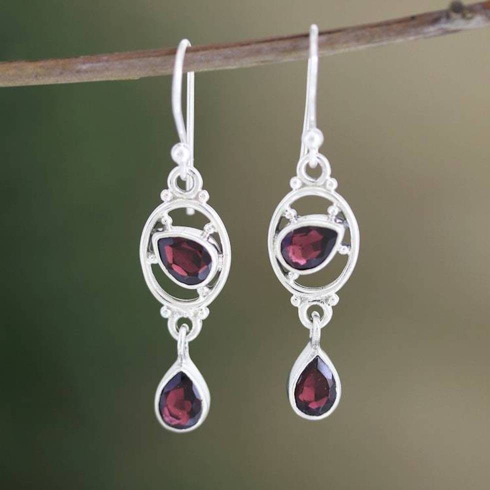 Garnet and Sterling Silver Dangle Earrings from India 'Balanced Glow' Item ID: 2676664007
