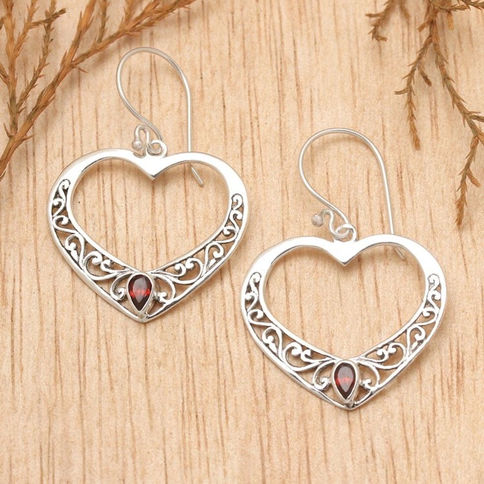 Garnet and Sterling Silver Heart Dangle Earrings from Bali 'Heart of Vines' Item ID: 2671483643