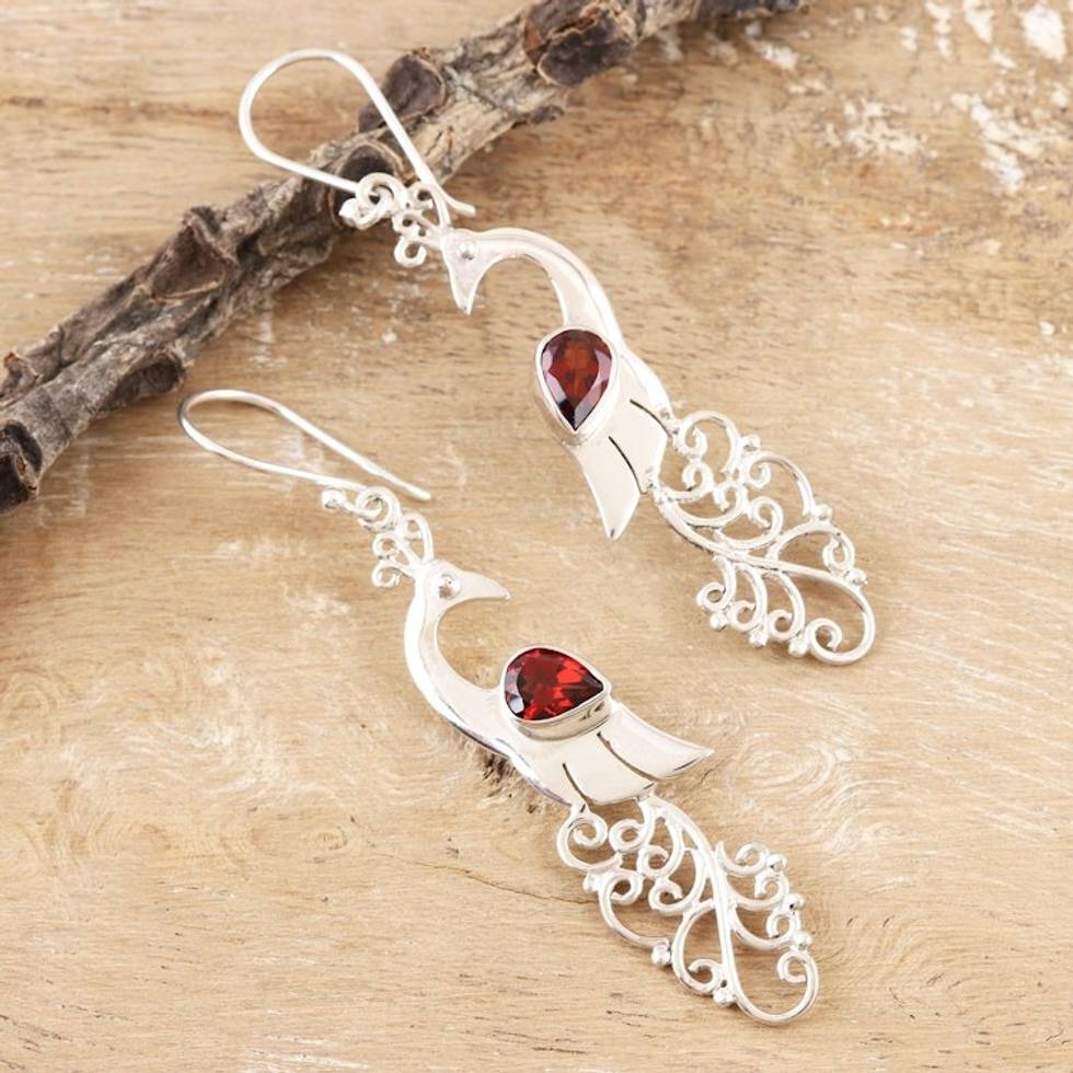 Garnet and Sterling Silver Peacock Dangle Earrings 'Indian Peacock in Red' Item ID: 2671787693