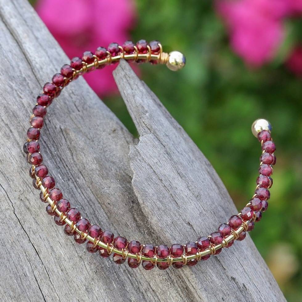 Garnet Beaded Polished 14k Gold-Accented Cuff Bracelet 'Red Lively Colors' Item ID: 2671797081