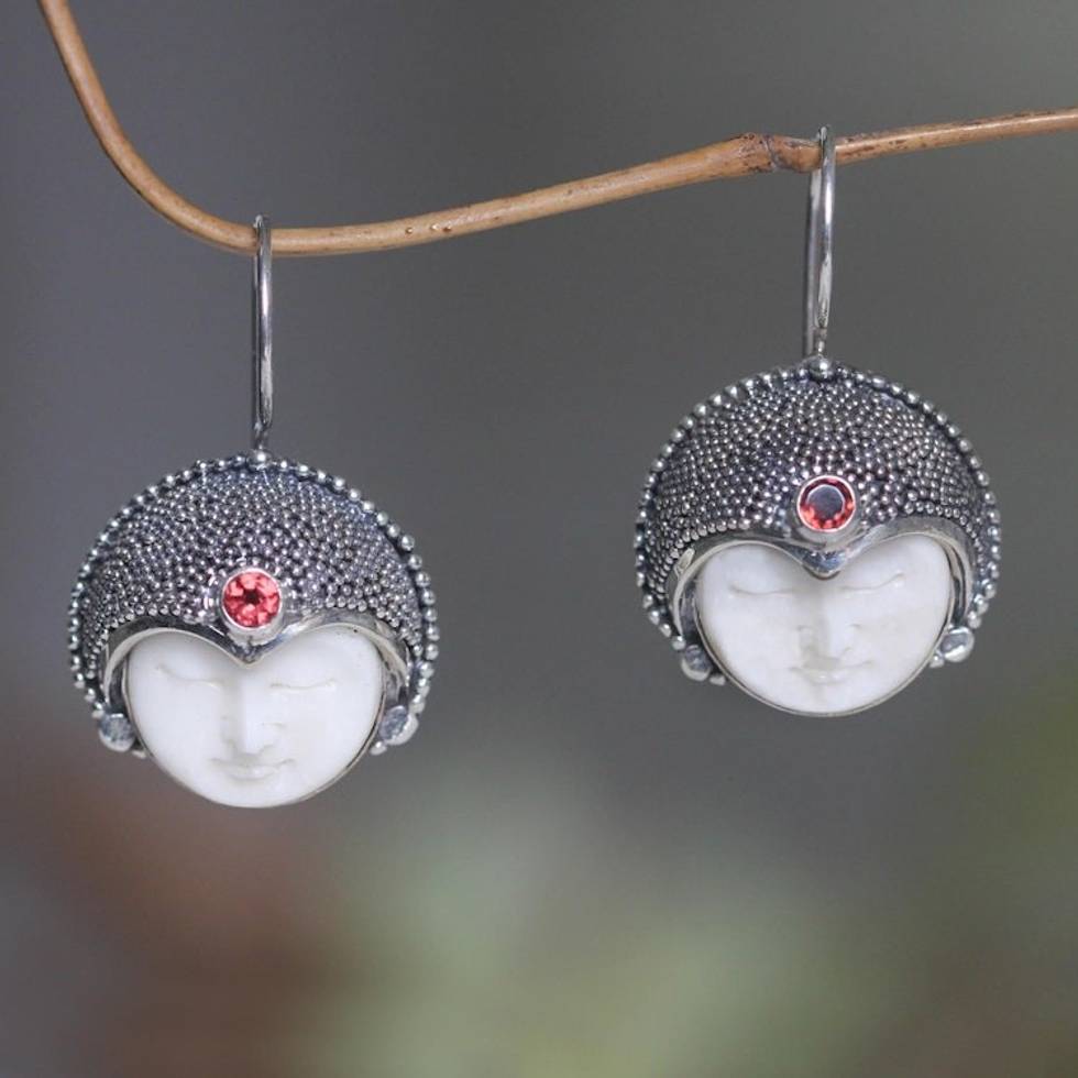 'Layonsari', carved pendant necklace with garnet is a pictured, with silver details and garnets of good color. Attractive chain, hangs pendant to good effect. Eye-catching. Well executed silver design setting for bone face carving. Happy with purchase.