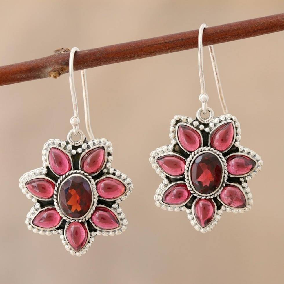 Garnet Flower-Shaped Dangle Earrings 'Camellia Blossoms' Item ID: 2669924520