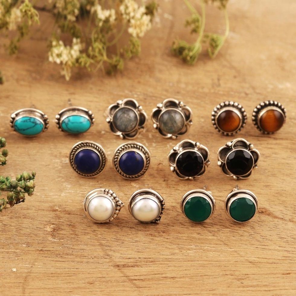 Gemstone Stud Earrings from India Set of 7 'Everyday Pairs' Item ID: 2669924472