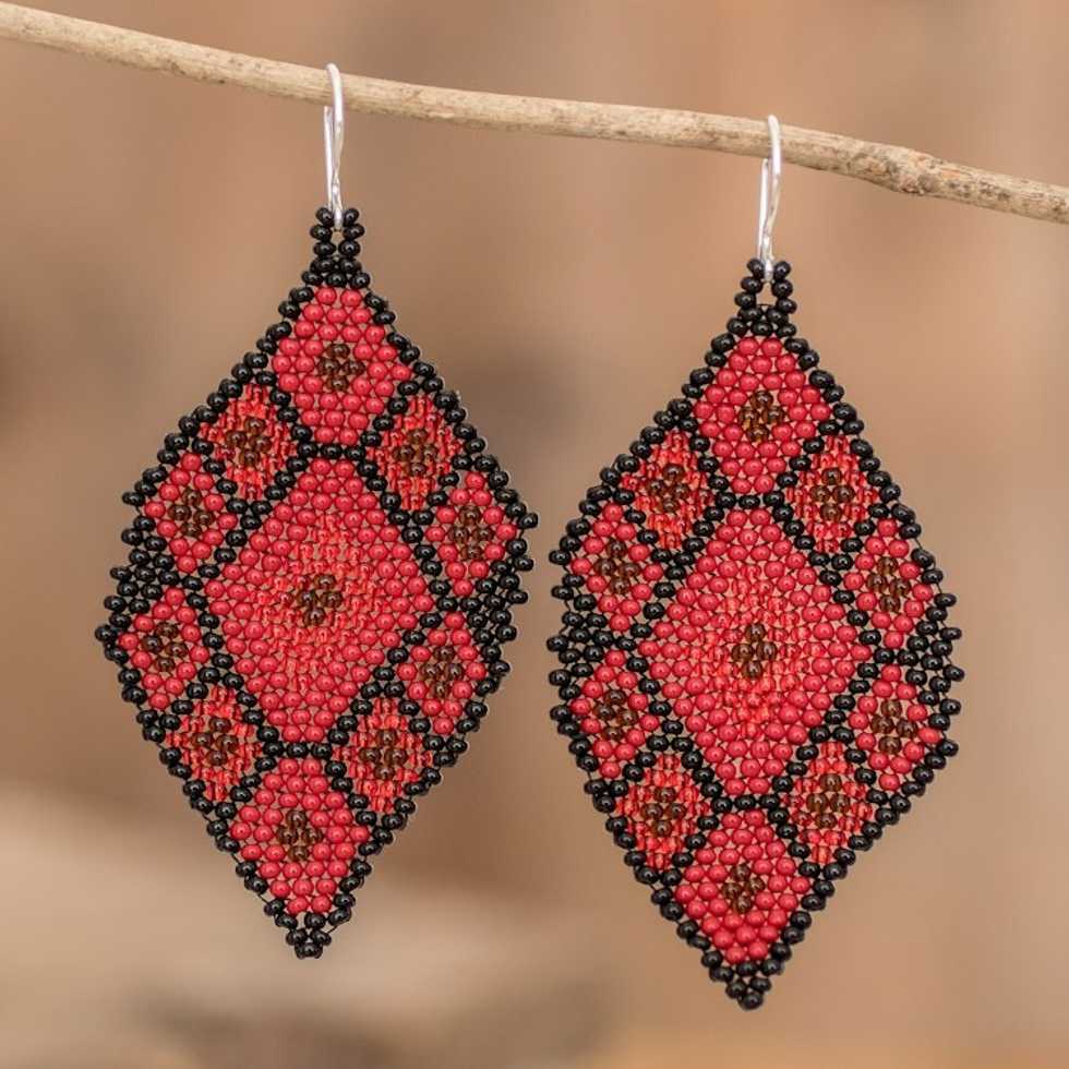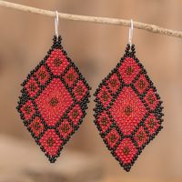 Geometric Beaded Dangle Earrings in Red and Black Hues 'Rhombus Trend in Red' Item ID: 2669933209