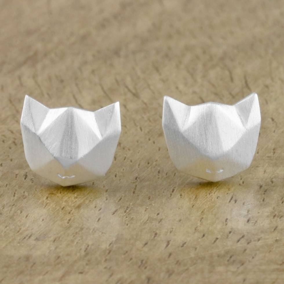 Geometric Cat Sterling Silver Stud Earrings from Thailand 'Cat Lover' Item ID: 2669925871