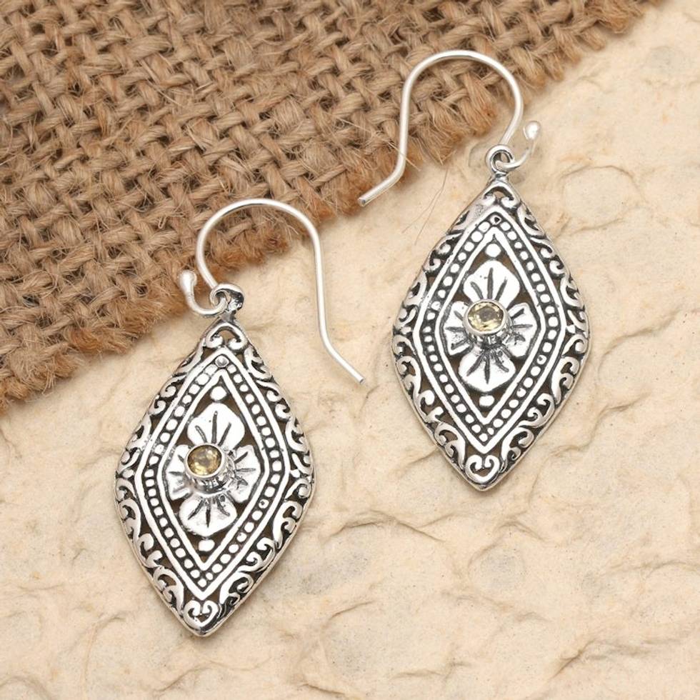 Geometric Floral Silver Dangle Earrings with Citrine Stones 'Kite Festival in Yellow' Item ID: 2671765141