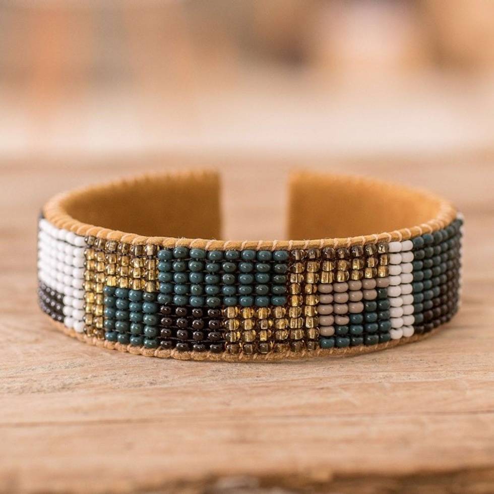 Geometric Glass Beaded Cuff Bracelet with Leather Accents 'Geometric Sparkles' Item ID: 2671626559