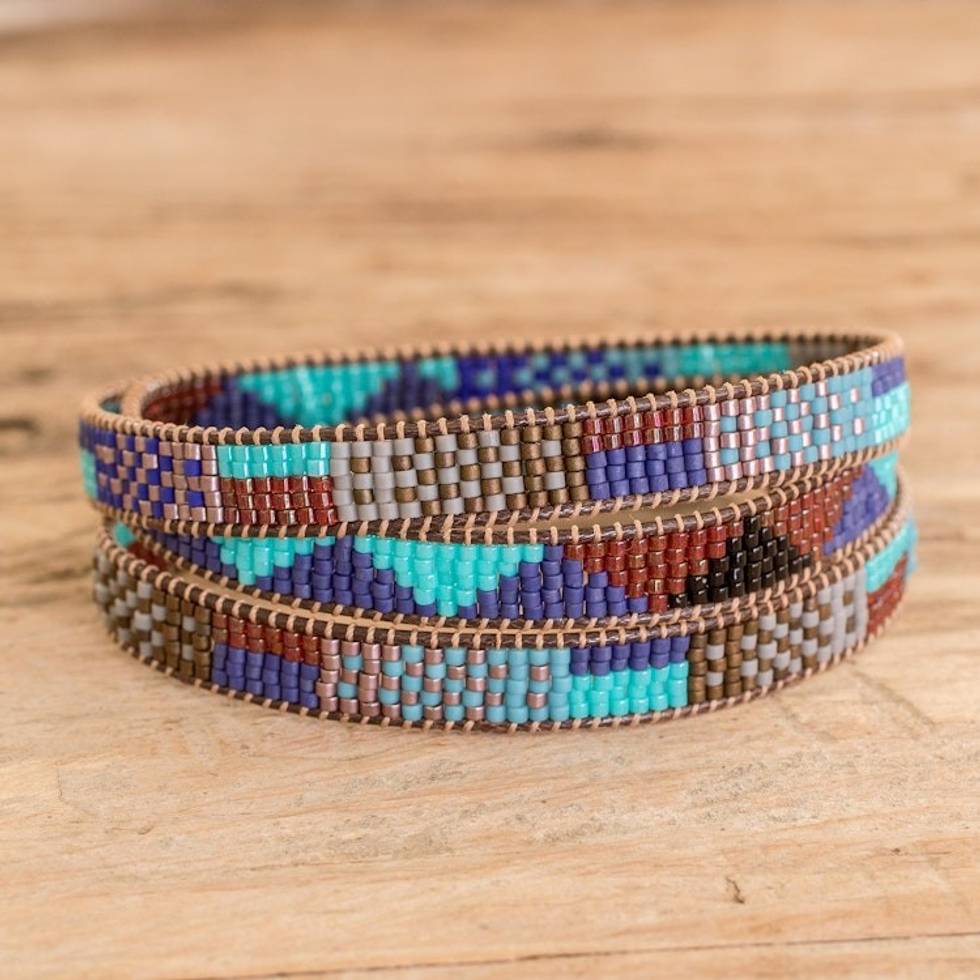 Geometric Glass Beaded Wrap Bracelet in Cool Palette 'Geometric Tradition' Item ID: 2669923566