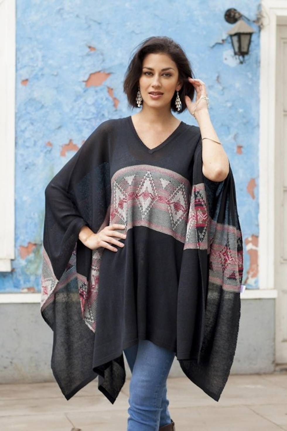 Geometric Pattern Cotton Blend Poncho in Black 'Mysterious Andes' Item ID: 2669891140