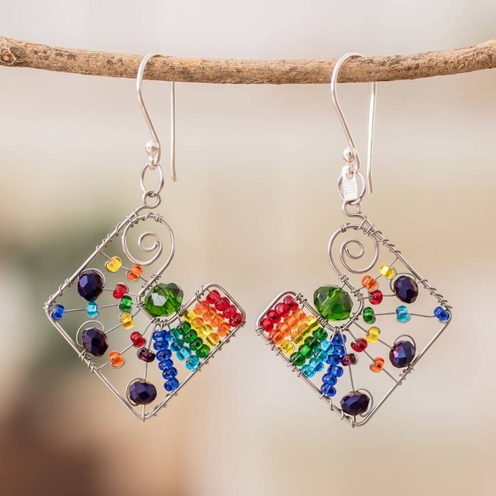 Geometric Rainbow Crystal and Glass Beaded Dangle Earrings 'Harmonious Constellation' Item ID: 2671626042