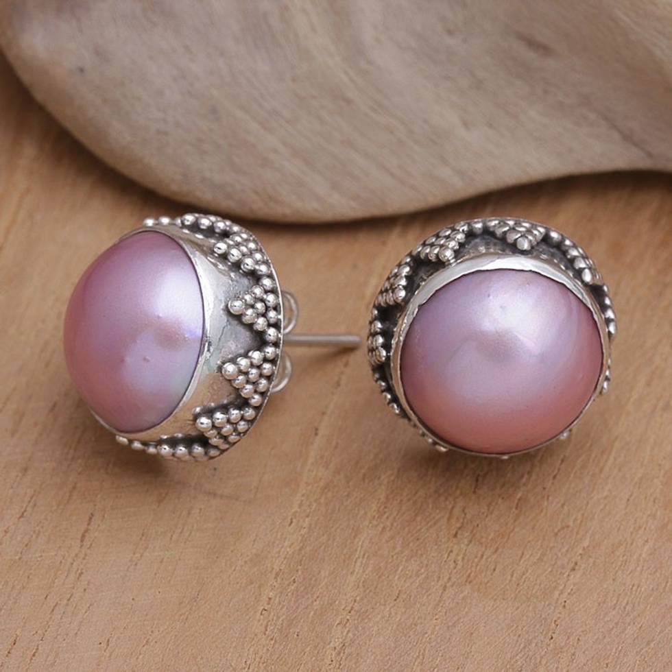 Geometric Sterling Silver Button Earrings with Pink Pearls 'Pink Pearl Treasure' Item ID: 2671748627