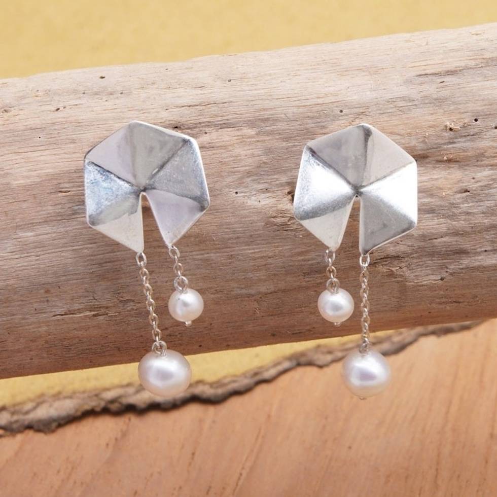 Geometric Sterling Silver Dangle Earrings with Grey Pearls 'Origami Lanterns' Item ID: 2671763462
