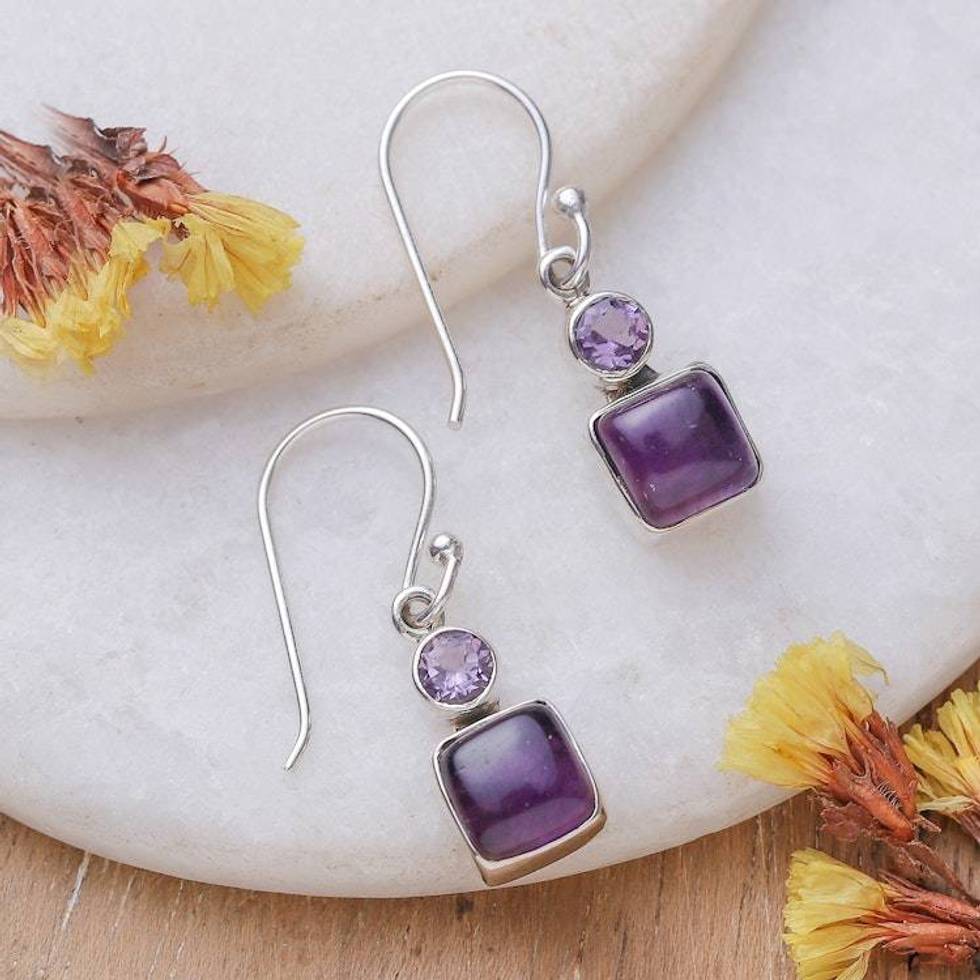 Geometric-Themed Birthstone Amethyst Stone Dangle Earrings 'Wise Fusion' Item ID: 2676664496